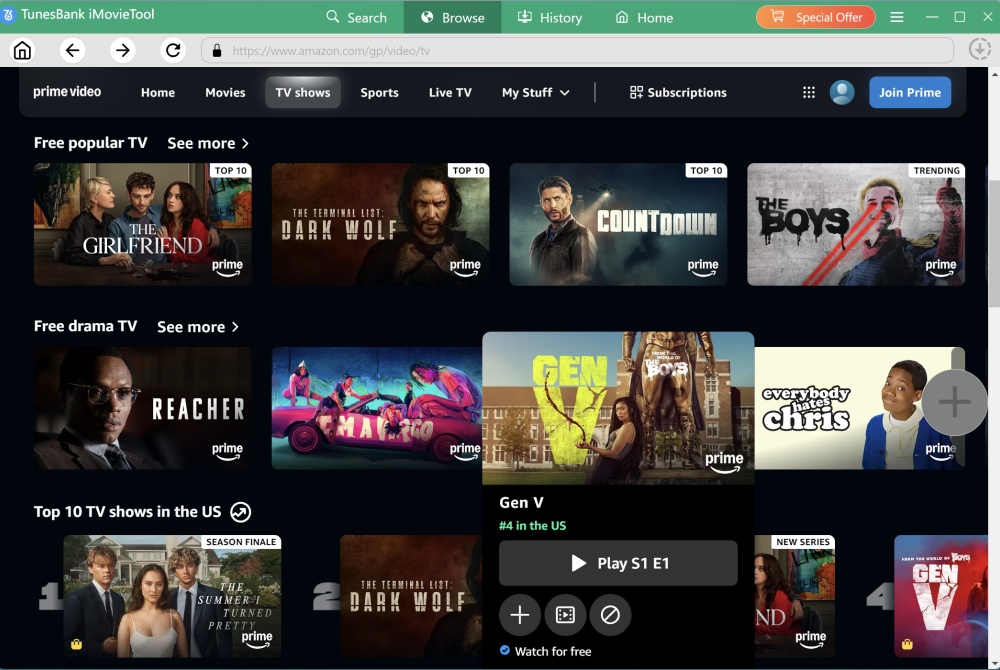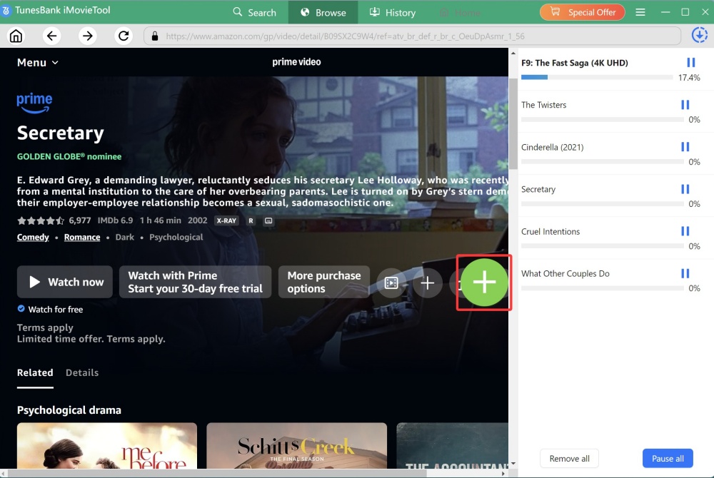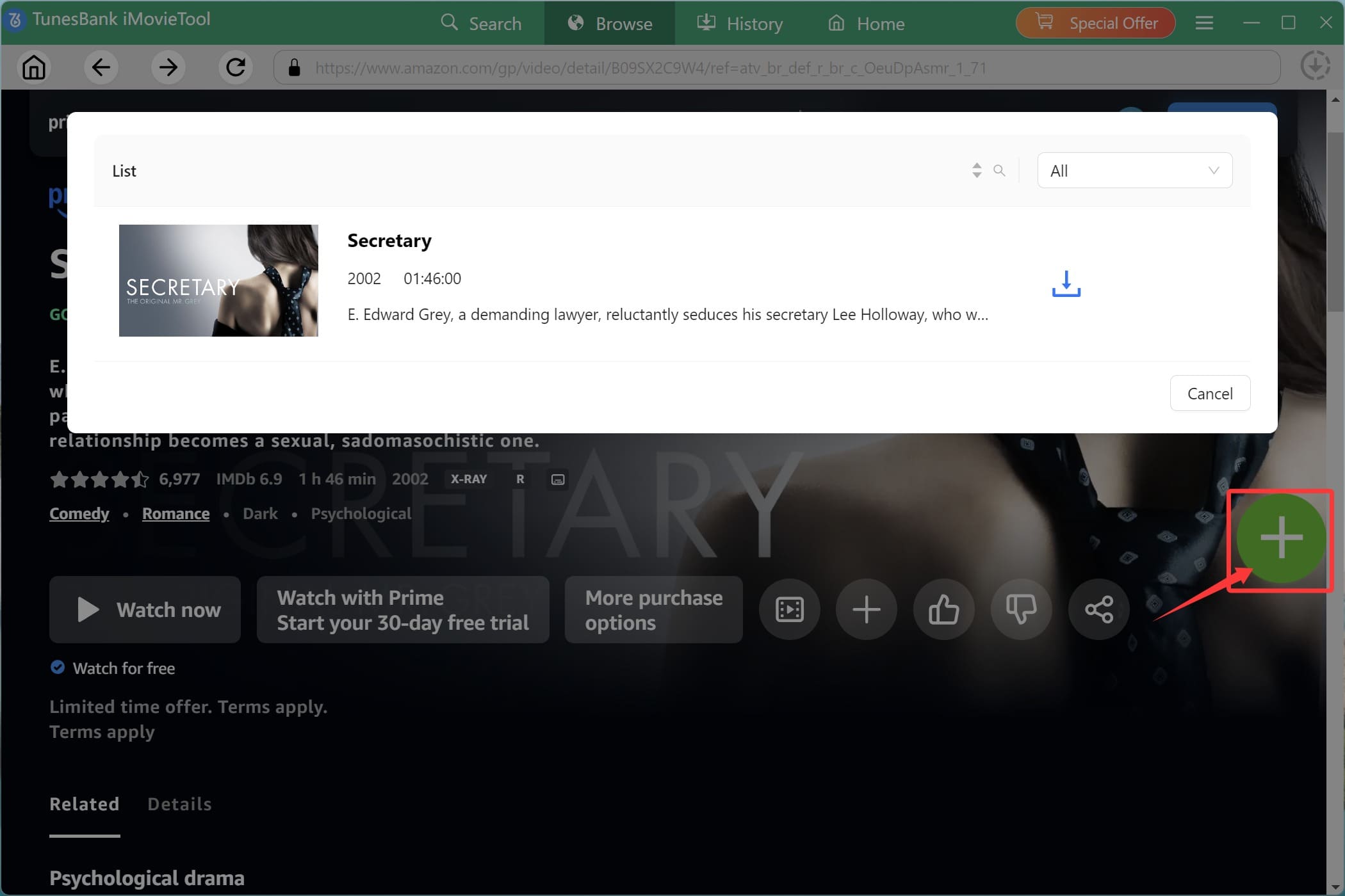 Once you've found the target Amazon video, click on it to open the streaming page. Click the green "+" icon. Before downloading, you may even play it online!