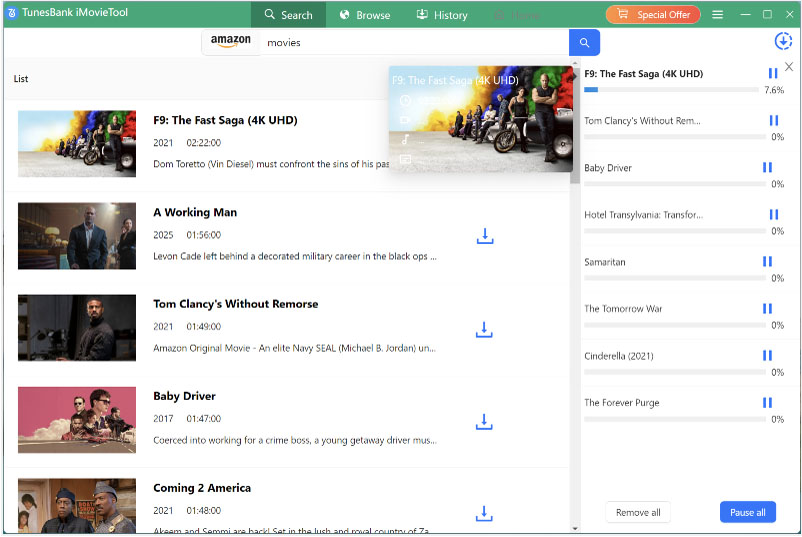 During Amazon video downloading process, TunesBank Amazon Video Downloader also allows you batch download movies and series at the same time, you can type the title of the movie or the TV show for searching, and then click the Download icon to add your desired Prime Video contents to the downloading list.