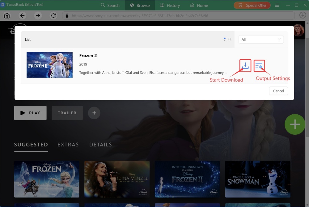 With a built-in Disney+ video web player, users don't need to install the Disney Plus app for video downloading. Just log in to your Disney+ account, search for any video content by entering the video name or URL in the search bar, set the output parameters, and start Disney+ video downloading. That's it!