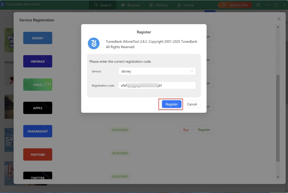 Once you purchased a registration, TunesBank Inc will send you the registration code via email. Click the "Register" option in the DISNEY section. Enter your registration code, and click "Register" button to unlock the full version.
