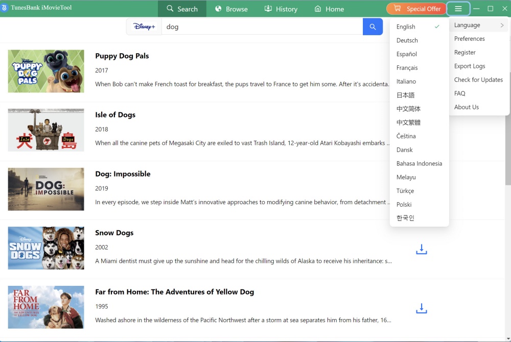 To better meet requirements of users from all over the world, we have released multilingual version of TunesBank Disney+ Downloader. The interface languages include: English, Chinese Simplified (简体中文), French (Français), Japanese (日本語), Spanish (Español) and German(Deutsch).